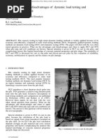 proven (Hussein, 1996) to assure load activation at reasonable stresses. Larger existing weights can be used provided the weight and shaft diameters remain about comparable. Regardless of size, shape or composition, the drop weight is generally guided to an axial impact by a short set of leads as in Figure 3, and is raised by cable and dropped by releasing the drum brake. 'An alternative and preferable drop method involves raising and securing the weight and then completely releasing it for a true free drop (e.g. releasing hydraulic jaws such as used for vibratory hammers used to grab steel piles, or by tripping a simple mechanical release) The test for a drilled shaft usually consists of a few separate impacts. A low drop height is first applied to assess signal quality and alignment of the weight with the shaft. After each impact, the net permanent displacement or "set per blow" is carefully measured to evaluate full capacity activation. Compressive stresses are compared with the concrete strength. Alignment adjustments are made if necessary and a second higher drop height is applied. The test continues with increasing drop heights until either the set per blow exceeds a value sufficient to insure the full capacity activation, or until the indicated capacity is above the required ultimate capacity, or until the stresses become too large and the risk of pile damage is then too high. Most tests are completed in less than five impacts. If the pile top has been built up to accommodate the dynamic test, the extra top section is removed to facilitate completing the foundation. The measured pile top strain and velocity data are analyzed by CAPWAP to independently check the total capacity mobilized for each blow. A CAPW AP analysis can be performed in a short time on site after each impact to determine if the set per blow is low so that the full capacity has not yet been activated and another larger impact is required. Upon completing the CAPWAP analysis, a simulated static load lest is obtained.