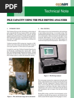 hammer IS greatly different than assumed. Fortunately, we can now simply measure the hammer performance and driving stresses as a result of research beginning in 1964 at Case Westem Reserve University in Cleveland Ohio under the direction of Dr. G_G. Goble (Goble et al. 1975, Goble et al. 1980). The initial goal of the Case research project was to measure the pile capacity using the pile hammer as the loading device. Capacity was evaluated by both closed form solutions and discrete numerical analysis and correlated with hundreds of static tests to refine the procedures and establish databases to assure the necessary reliability. In addition to estimating capacity, the equipment developed over many years into a complete inspection of hammer performance, driving stresses and pile integrity and is known today as a "Pile Driving Analyzer?", or simply tbe "PDA"