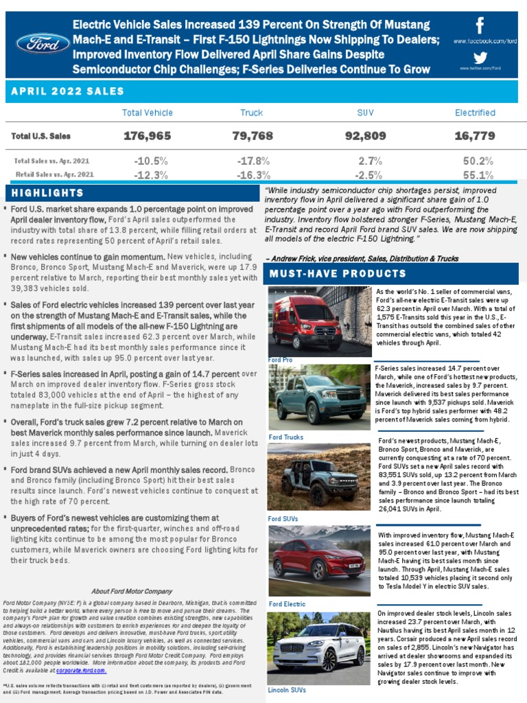 FORD MOTOR COMPANY APRIL 2022 U.S. SALES