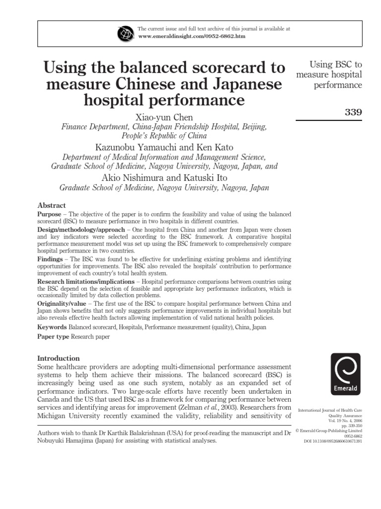 Keywords Balanced scorecard, Hospitals, Performance measurement (quality), China, Japan