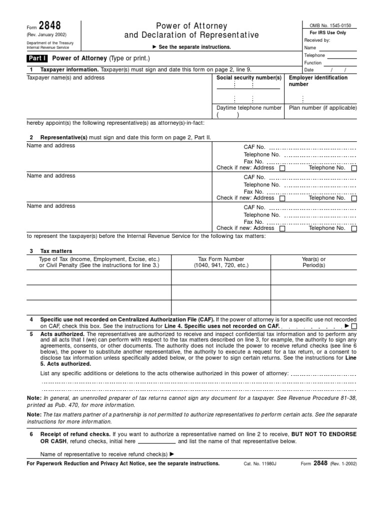 For Paperwork Reduction and Privacy Act Notice, see the separate instructions. Cat. No. 11980J Form 2848 (Rev. 1-2002)