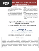 This document provides information about an engineering statistics and linear algebra course at Sai Vidya Institute of Technology. The course is being taught in the 4th semester of the Electronics and Communication Engineering program. It covers topics related to random processes including probability density functions, stationarity, correlation functions, power spectral densities, and linear systems with noise. The course coordinator is Venkatesha M from the ECE department who provides their contact information.