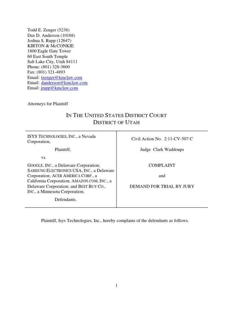 ., a Minnesota Corporation; Defendants. Civil Action No. 2:11-CV-507 C Judge Clark Waddoups COMPLAINT and DEMAND FOR TRIAL BY JURY Plaintiff, Isys Technologies, Inc., hereby complains of the defendants as follows.