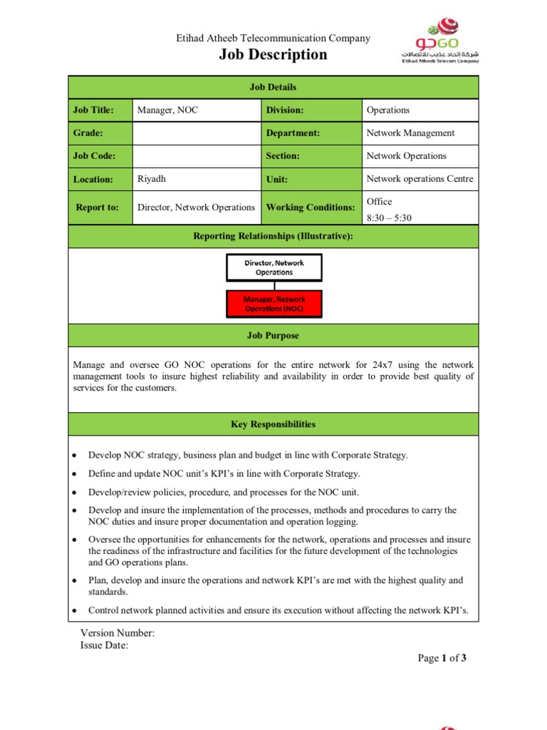 Job Details Job Title: Grade: Job Code: Location: Report to: Riyadh Director, Network Operations Manager, NOC Division: Department: Section: Unit: Working Conditions: Operations Network Management Network Operations Network operations Centre Office 8:30 5:30 Reporting Relationships (Illustrative):