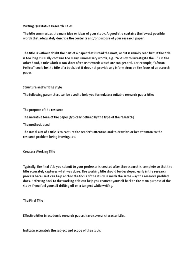 The title summarizes the main idea or ideas of your study. A good title contains the fewest possible