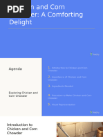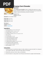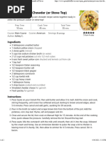 Bring to a boil; reduce heat and simmer, uncovered, for about 5 minutes. Whip cream with salt until stiff. Pour soup into a tureen, add whipped cream, and stir lightly. Makes 8 to 10 servings. Fresh Corn Chowder 6 fresh medium ears of corn 1/4 cup chopped onion 4 cups milk 2 tablespoons butter 3 tablespoons all purpose flour 1 slightly beaten egg Using a sharp knife, cut tips of corn kernels off cobs. Scrape cobs. In a saucepan combine the corn, onion, 1/2 cup water and 1/2 teaspoon salt. Bring to a boi, reduce heat. Cover; simmer about 15 minutes or till corn is barely done, stirring occasionally. Stir in 3 1/2 cups of the milk, butter, 1 teaspoon salt and 1/4 teaspoon pepper. Combine the remaining 1/2 cup milk and the flour. Add milk-flour mixture to corn mixture. Cook and stir till thickened and bubbly. Gradually stir about 1 cup of the hot mixture into beaten egg. Return to hot mixture in saucepan. Cook over low heat for 2 minutes more, stirring constantly (do not boil). If desired, garnish soup with snipped chives and paprika or crumbled bacon. Serves 6. Quick Cheesy Chicken-Corn Chowder 1 whole small chicken breast 1/4 cup chopped onion Stephanie da Silva's Corn Chowder Collection http://www.cs.cmu.edu/~mjw/recipes/soup/chowder/sds-cornchow-coll.html (3 of 6) [12/17/1999 12:01:40 PM] 1/4 cup chopped celery 1 10 3/4-ounce can condensed cream of chicken soup 1 8 3/4-ounce can whole kernel corn 1/2 cup milk 1/2 cup shredded American cheese 2 tablespoons chopped pimiento In a saucepan combine chicken, onion, celery, and 1/4 cup water. Bring to a boil, reduce heat. Cover and simmer 15 to 20 minutes. Remove chicken; when cool, cut off meat and chop. Return meat to broth; stir in remaining ingredients. Cook, uncovered, for 10 minutes. Corn Chowder 1 pound can cream-style corn 3 slices bacon, cut in 1/2-inch pieces 1/4 cup chopped onion 21/4 cup chopped celery 1 1/2 cups diced cooked potatoes 1 1/2 teaspoons salt 1/8 teaspoon pepper 1/8 teaspoon thyme 2 cups milk 1 cup water 2 tablespoons butter Fry bacon in skillet until almost crisp. Add onions and celery. Saute until tender; drain. Combine bacon mixture, potatoes, water, salt, pepper and thyme in large saucepan. Simmer 10 minutes. Add milk and corn. Heat thoroughly; do not boil. Top each serving with 1 teaspoon butter. Corn Chowder