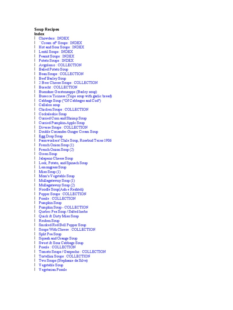 Soups : INDEX l Peanut Soups : INDEX l Potato Soups : INDEX l Avgolemo : COLLECTION l Baked Potato Soup l Bean Soups : COLLECTION l Beef Barley Soup l 2 Beer Cheese Soups : COLLECTION l Borscht : COLLECTION l Buendner Gerstensuppe (Barley soup) l Busecca Ticinese (Tripe soup with garlic bread) l Cabbage Soup ("Of Cabbages and Cod") l Callaloo soup l Chicken Soups : COLLECTION l Cockaleekie Soup l Curried Corn and Shrimp Soup l Curried Pumpkin-Apple Soup l Diverse Soups : COLLECTION l Double Coriander-Ginger Cream Soup l Egg Drop Soup l Farmworkers' Chile Soup, Rosebud Texas 1906 l French Onion Soup (1) l French Onion Soup (2) l Green Soup l Jalapeno Cheese Soup l Leek, Potato, and Spinach Soup l Lemongrass Soup l Miso Soup (1) l Mom's Vegetable Soup l Mullagatawny Soup (1) l Mullagatawny Soup (2) l Noodle Soup(Ash-e Reshteh) l Pepper Soups : COLLECTION l Posole : COLLECTION l Pumpkin Soup l Pumpkin Soup - COLLECTION l Quebec Pea Soup / Salted herbs l Quick & Dirty Miso Soup l Reuben Soup l Smoked Red Bell Pepper Soup l Soups With Cheese : COLLECTION l Split Pea Soup l Squash and Orange Soup l Sweet & Sour Cabbage Soup l Posole : COLLECTION l Tomato Soups / Gazpacho : COLLECTION l Tortellini Soups : COLLECTION l Two Soups (Stephanie da Silva) l Vegetable Soup l Vegetarian Posole