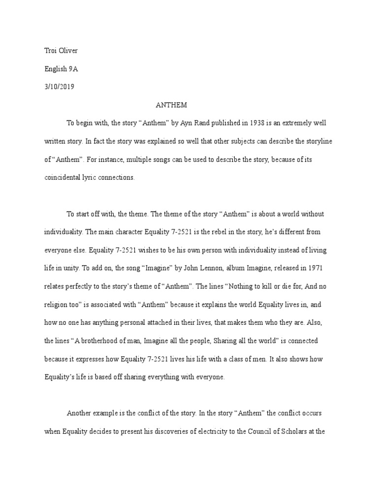 Another example is the conflict of the story. In the story “Anthem” the conflict occurs