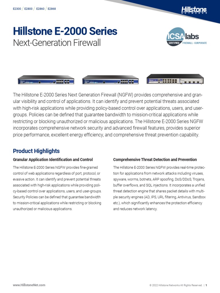 The Hillstone E-2000 Series Next Generation Firewall (NGFW) provides comprehensive and gran-