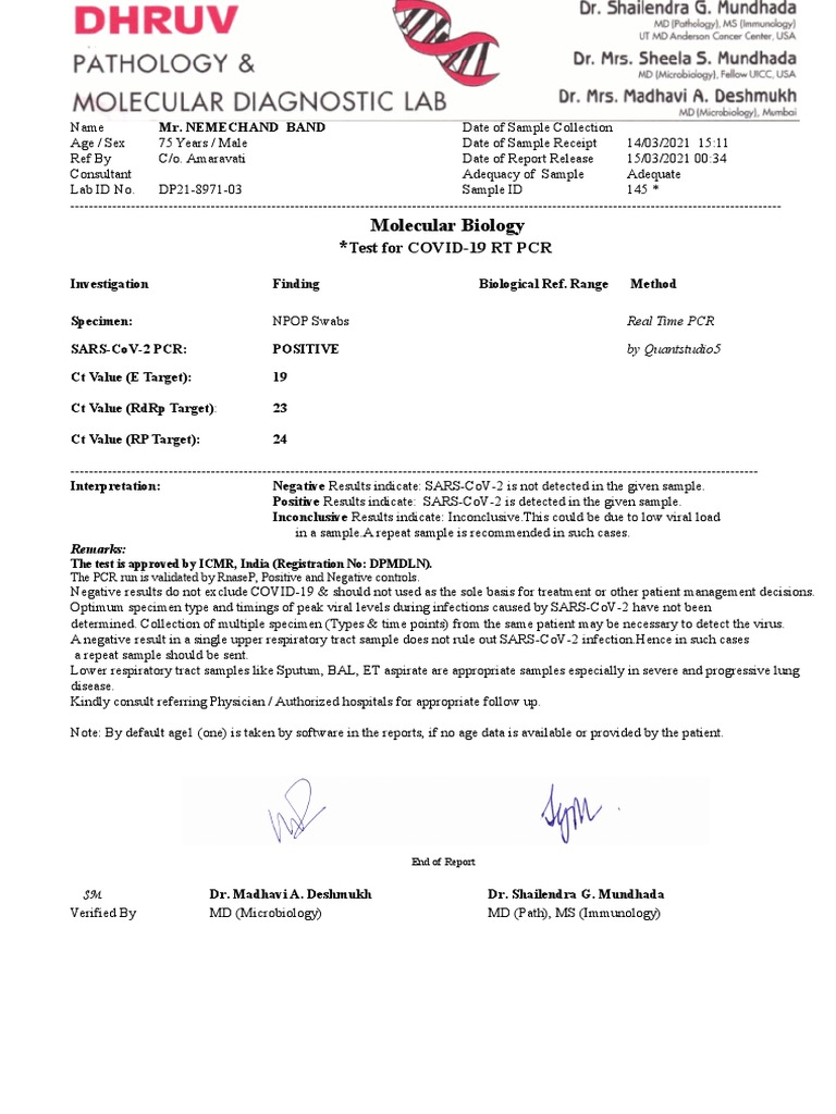Age / Sex 75 Years / Male Date of Sample Receipt 14/03/2021 15:11