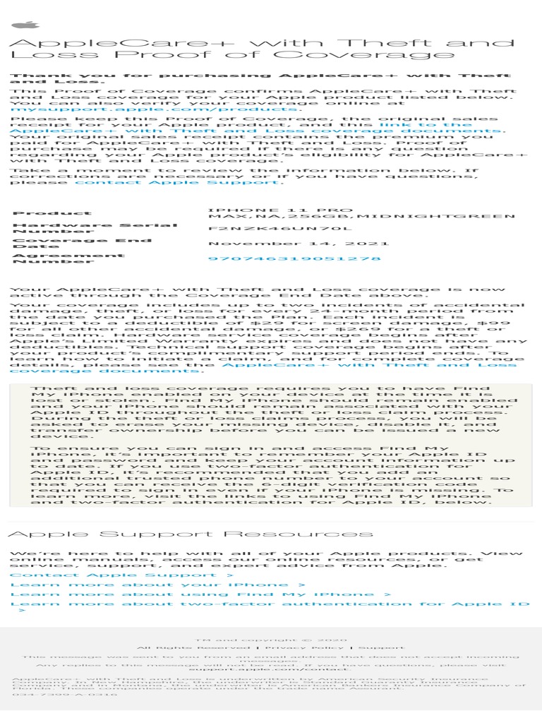 This Proof of Coverage confirms AppleCare+ with Theft