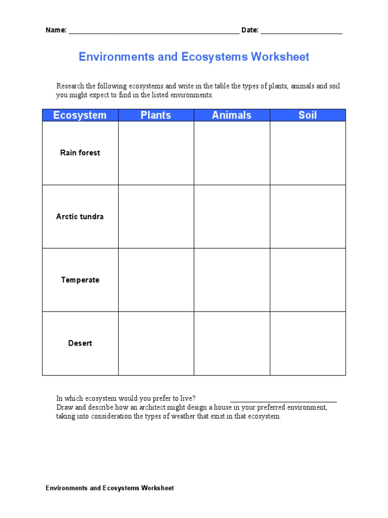 Research the following ecosystems and write in the table the types of plants, animals and soil