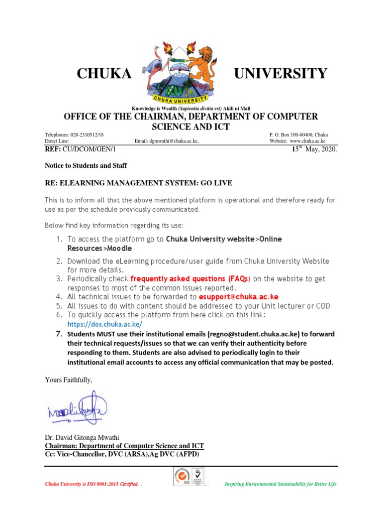 4. All technical issues to be forwarded to esupport@chuka.ac.ke
