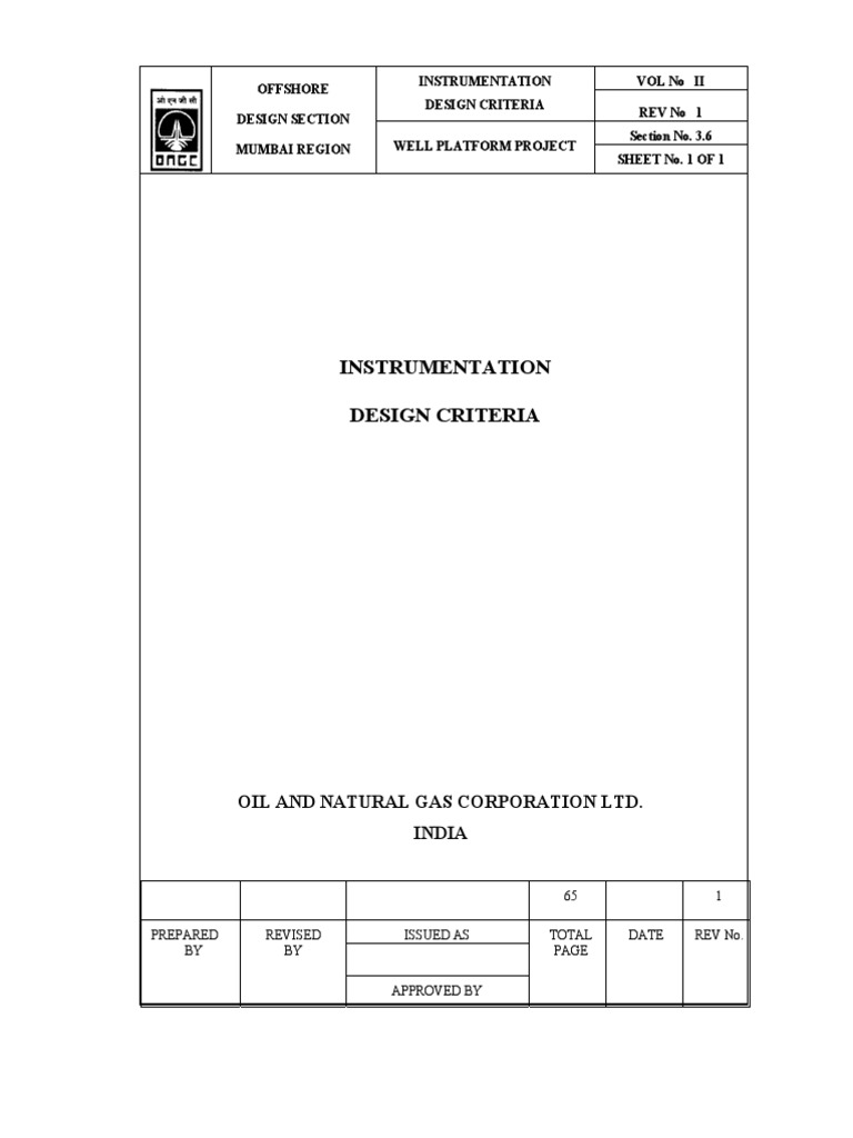 SCOPE OF THIS DOCUMENT: This document defines the design criteria for the instrumentation and control system envisaged on the new platforms and under the new project. Note: The scope of instrumentation activities pertaining to this project is enlisted in the relevant section of Scope of Work. The functional specifications of individual items shall be as given in scope of work Instrumentation.