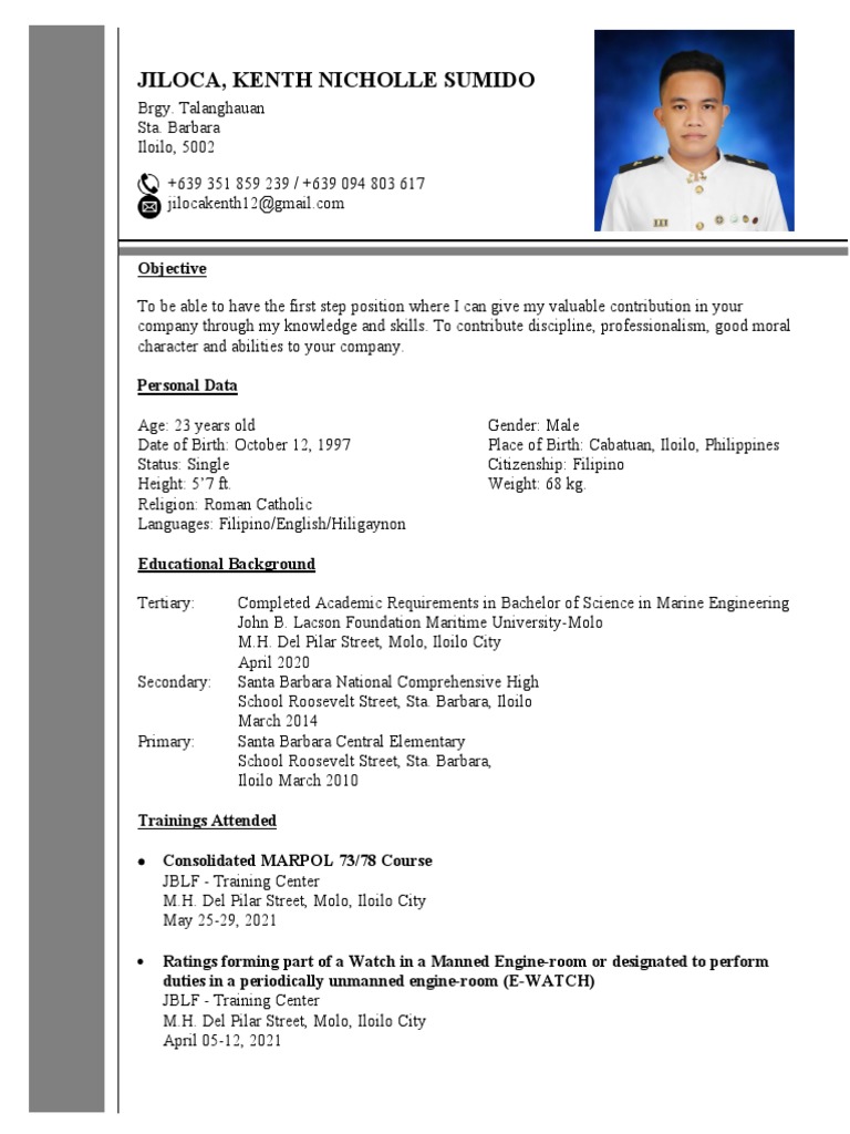 Date of Birth: October 12, 1997 Place of Birth: Cabatuan, Iloilo, Philippines