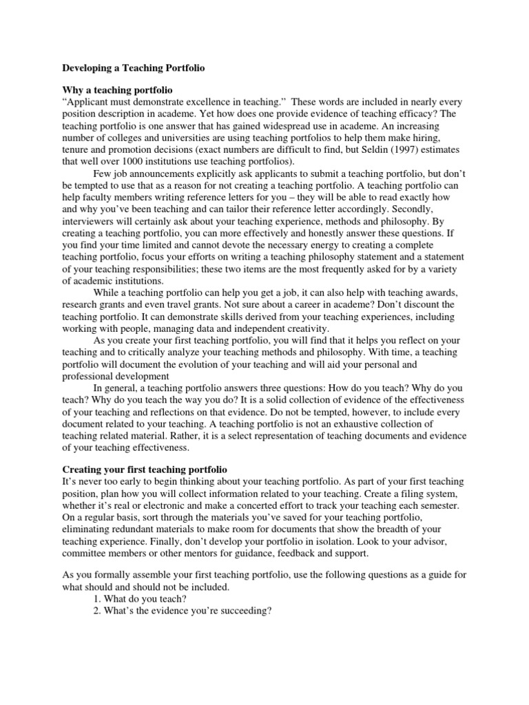These words are included in nearly every position description in academe. Yet how does one provide evidence of teaching efficacy? The teaching portfolio is one answer that has gained widespread use in academe. An increasing number of colleges and universities are using teaching portfolios to help them make hiring, tenure and promotion decisions (exact numbers are difficult to find, but Seldin (1997) estimates that well over 1000 institutions use teaching portfolios). Few job announcements explicitly ask applicants to submit a teaching portfolio, but dont be tempted to use that as a reason for not creating a teaching portfolio. A teaching portfolio can help faculty members writing reference letters for you they will be able to read exactly how and why youve been teaching and can tailor their reference letter accordingly. Secondly, interviewers will certainly ask about your teaching experience, methods and philosophy. By creating a teaching portfolio, you can more effectively and honestly answer these questions. If you find your time limited and cannot devote the necessary energy to creating a complete teaching portfolio, focus your efforts on writing a teaching philosophy statement and a statement of your teaching responsibilities; these two items are the most frequently asked for by a variety of academic institutions. While a teaching portfolio can help you get a job, it can also help with teaching awards, research grants and even travel grants. Not sure about a career in academe? Dont discount the teaching portfolio. It can demonstrate skills derived from your teaching experiences, including working with people, managing data and independent creativity. As you create your first teaching portfolio, you will find that it helps you reflect on your teaching and to critically analyze your teaching methods and philosophy. With time, a teaching portfolio will document the evolution of your teaching and will aid your personal and professional development In general, a teaching portfolio answers three questions: How do you teach? Why do you teach? Why do you teach the way you do? It is a solid collection of evidence of the effectiveness of your teaching and reflections on that evidence. Do not be tempted, however, to include every document related to your teaching. A teaching portfolio is not an exhaustive collection of teaching related material. Rather, it is a select representation of teaching documents and evidence of your teaching effectiveness. Creating your first teaching portfolio Its never too early to begin thinking about your teaching portfolio. As part of your first teaching position, plan how you will collect information related to your teaching. Create a filing system, whether its real or electronic and make a concerted effort to track your teaching each semester. On a regular basis, sort through the materials youve saved for your teaching portfolio, eliminating redundant materials to make room for documents that show the breadth of your teaching experience. Finally, dont develop your portfolio in isolation. Look to your advisor, committee members or other mentors for guidance, feedback and support. As you formally assemble your first teaching portfolio, use the following questions as a guide for what should and should not be included. 1. What do you teach? 2. Whats the evidence youre succeeding?