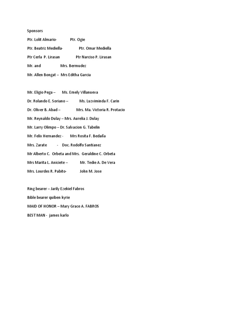 The document lists the sponsors for a wedding ceremony. It provides the names of the sponsors paired together, including titles or honorifics for some individuals. It also lists a ring bearer, bible bearer, maid of honor and best man for the ceremony.