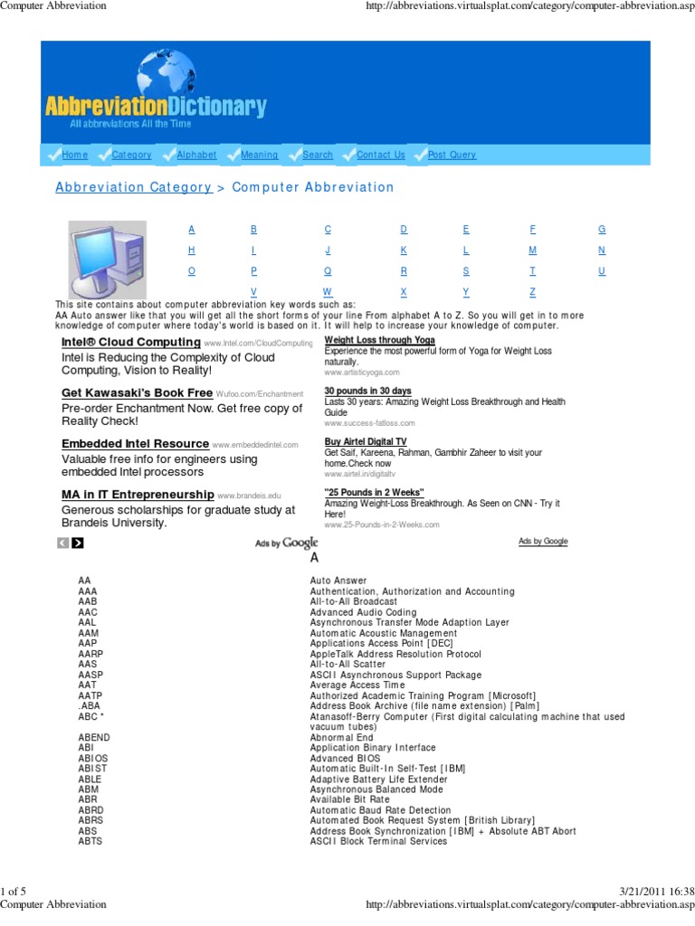 W X Y Z V This site contains about computer abbreviation key words such as: AA Auto answer like that you will get all the short forms of your line From alphabet A to Z. So you will get in to more knowledge of computer where today's world is based on it. It will help to increase your knowledge of computer.