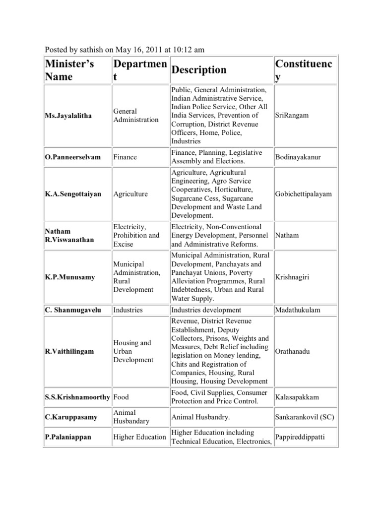 Social Welfare including Womens and Childrens Welfare, Nutritious Noon Meal, Welfare of the Disabled, Bhuvanagiri Orphanages and Correctional Administration, Integrated Child Development and Beggar Homes. Handlooms and Textiles Hindu Religious and Charitable Endowments (HR & CE). Public Works. Thiruvallur Srivaikuntam Erode (West)