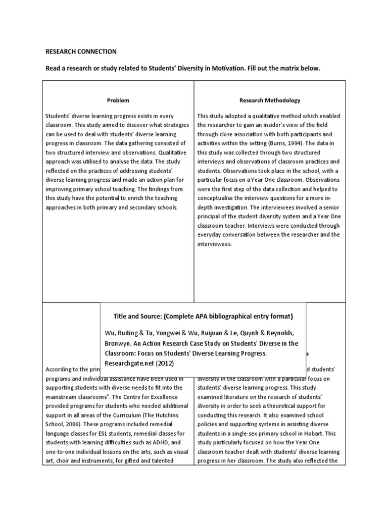 Read a research or study related to Students’ Diversity in Motivation. Fill out the matrix below.