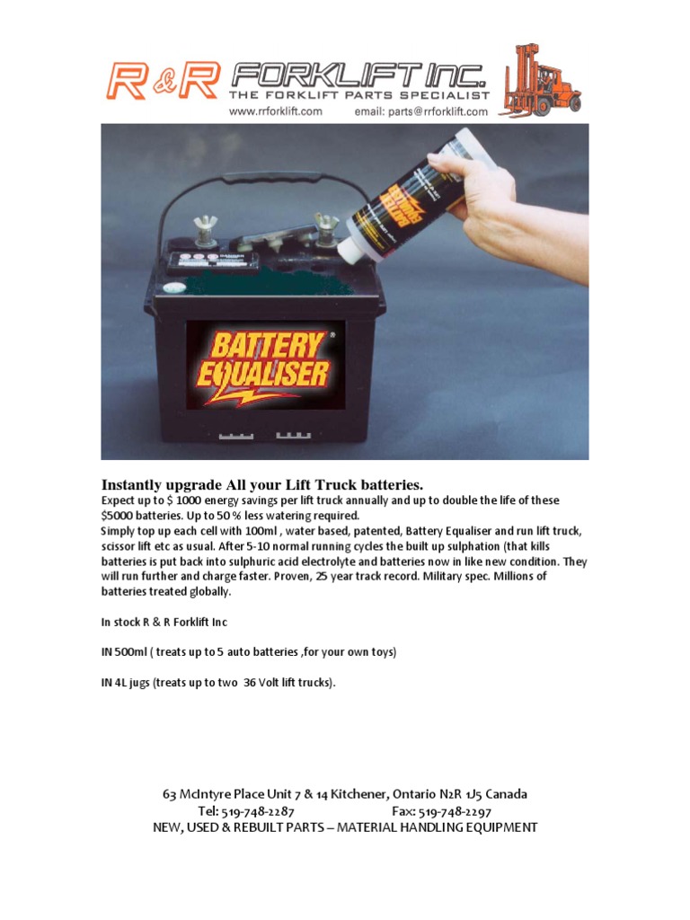 Expectupto$1000energysavingsperlifttruckannuallyanduptodoublethelifeofthese $5000batteries.Upto50%lesswateringrequired. Simplytopupeachcellwith100ml,waterbased,patented,BatteryEqualiserandrunlifttruck, scissorliftetcasusual.After510normalrunningcyclesthebuiltupsulphation(thatkills batteriesisputbackintosulphuricacidelectrolyteandbatteriesnowinlikenewcondition.They willrunfurtherandchargefaster.Proven,25yeartrackrecord.Militaryspec.Millionsof batteriestreatedglobally. InstockR&RForkliftInc IN500ml(treatsupto5autobatteries,foryourowntoys) IN4Ljugs(treatsuptotwo36Voltlifttrucks).