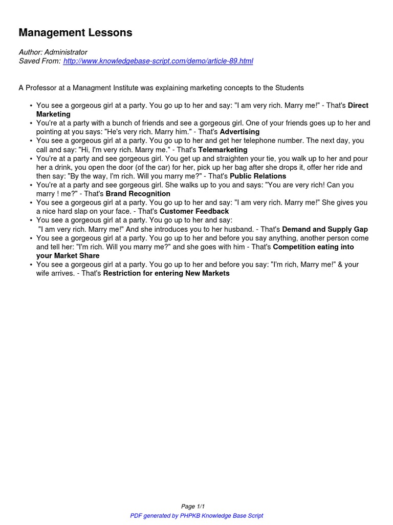 A Professor at a Managment Institute was explaining marketing concepts to the Students
