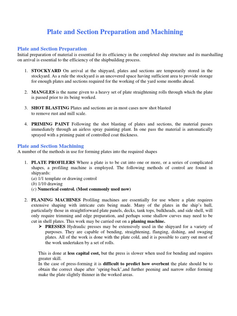 Initial preparation of material is essential for its efficiency in the completed ship structure and its marshalling on arrival is essential to the efficiency of the shipbuilding process. 1. STOCKYARD On arrival at the shipyard, plates and sections are temporarily stored in the stockyard. As a rule the stockyard is an uncovered space having sufficient area to provide storage for enough plates and sections required for the working of the yard some months ahead. 2. MANGLES is the name given to a heavy set of plate straightening rolls through which the plate is passed prior to its being worked. 3. SHOT BLASTING Plates and sections are in most cases now shot blasted to remove rust and mill scale. 4. PRIMING PAINT Following the shot blasting of plates and sections, the material passes immediately through an airless spray painting plant. In one pass the material is automatically sprayed with a priming paint of controlled coat thickness.
