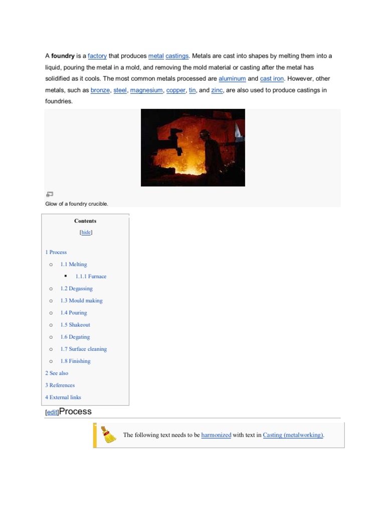 1.2 Degassing 1.3 Mould making 1.4 Pouring 1.5 Shakeout 1.6 Degating 1.7 Surface cleaning 1.8 Finishing