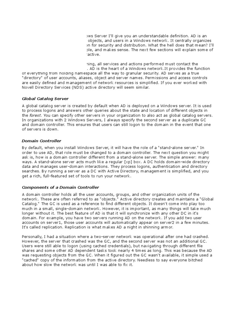 AD is an organizational database of all the objects, and users in a Windows network. It centrally organizes all the resources in an organization for security and distribution. What the hell does that mean? I'll explain it. It's actually pretty simple, and makes sense. The next few sections will explain some of the features that make AD so attractive. Think of AD as a "directory." Meaning, all services and actions performed must contact the directory for details and locations. AD is the heart of a Windows network.It provides the function of everything from holding namespace all the way to granular security. AD serves as a true "directory" of user accounts, aliases, object and server names. Permissions and access controls are easily defined and management of network resources is simplified. If you ever worked with Novell Directory Services (NDS) active directory will seem similar. Global Catalog Server A global catalog server is created by default when AD is deployed on a Windows server. It is used to process logons and answers other queries about the state and location of different objects in the forest. You can specify other servers in your organization to also act as global catalog servers. In organizations with 2 Windows Servers, I always specify the second server as a duplicate GC and domain controller. This ensures that users can still logon to the domain in the event that one of servers is down. Domain Controller By default, when you install Windows Server, it will have the role of a "stand-alone server." In order to use AD, that role must be changed to a domain controller. The next question you might ask is, how is a domain controller different from a stand-alone server. The simple answer: many ways. A stand-alone server acts much like a regular [xp] box. A DC holds domain-wide directory data and manages user-domain interactions. They process logons, authentication and directory searches. By running a server as a DC with Active Directory, management is simplified, and you get a rich, full-featured set of tools to run your network. Components of a Domain Controller A domain controller holds all the user accounts, groups, and other organization units of the network. These are often referred to as "objects." Active directory creates and maintains a "Global Catalog." The GC is used as a reference to find different objects. It doesn't come into play too much in a small, single-domain network. However, it is important, as many things will take much longer without it. The best feature of AD is that it will synchronize with any other DC in it's domain. For example, you have two servers running AD on the network. If you add two user accounts on server1, those user accounts will automatically appear on server2 in a few minutes. It's called replication. Replication is what makes AD a night in shinning armor. Personally, I had a situation where a two-server network was operational after one had crashed. However, the server that crashed was the GC, and the second server was not an additional GC. Users were still able to logon (using cached credentials), but navigating through different file shares and some other AD dependent tasks took nearly 4 times as long. This was because the AD was requesting objects from the GC. When it figured out the GC wasn't available, it simple used a "cached" copy of the information from the active directory. Needless to say everyone bitched about how slow the network was until I was able to fix it.