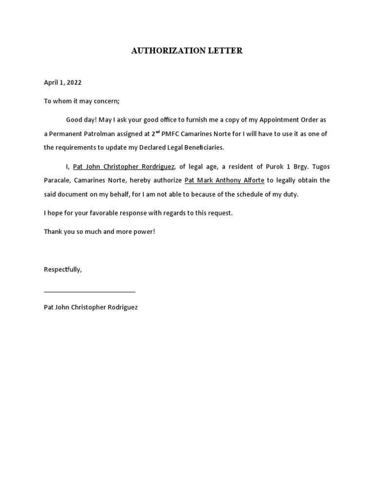 Paracale, Camarines Norte, hereby authorize Pat Mark Anthony Alforte to legally obtain the