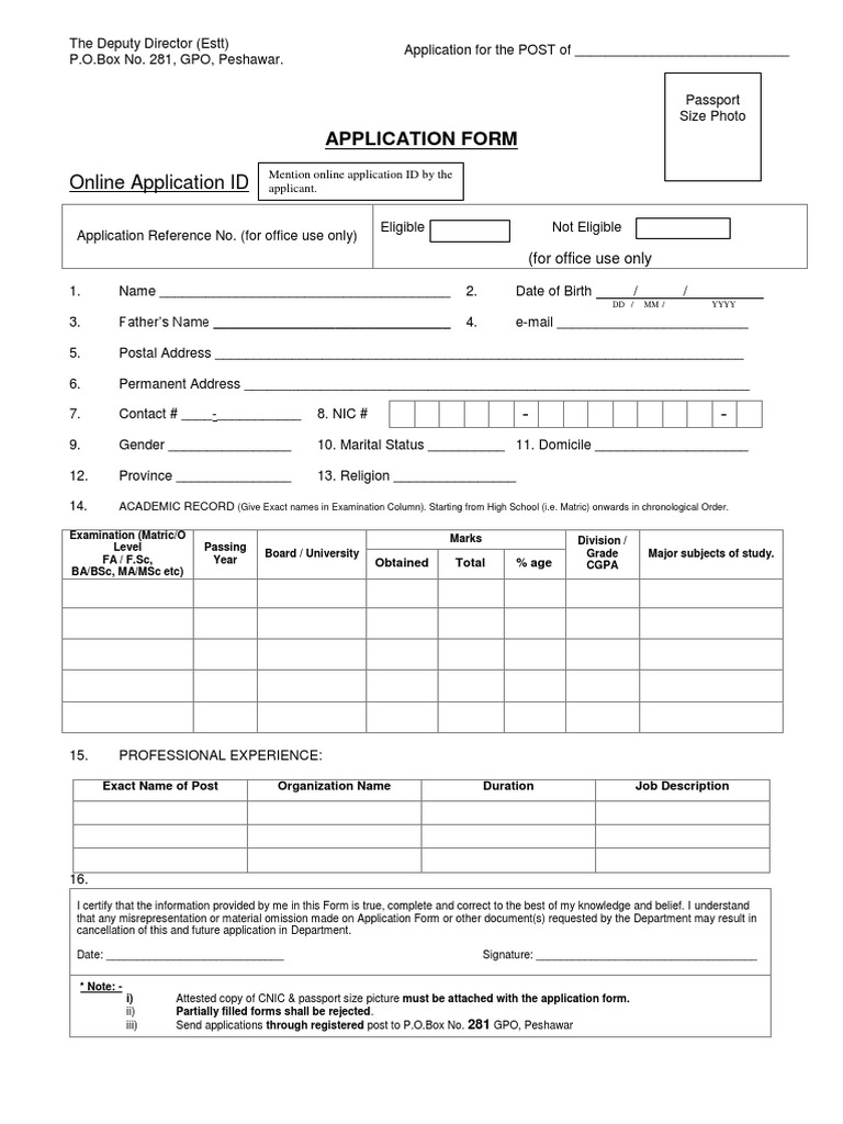 The Deputy Director (Estt) Application for the POST of ____________________________