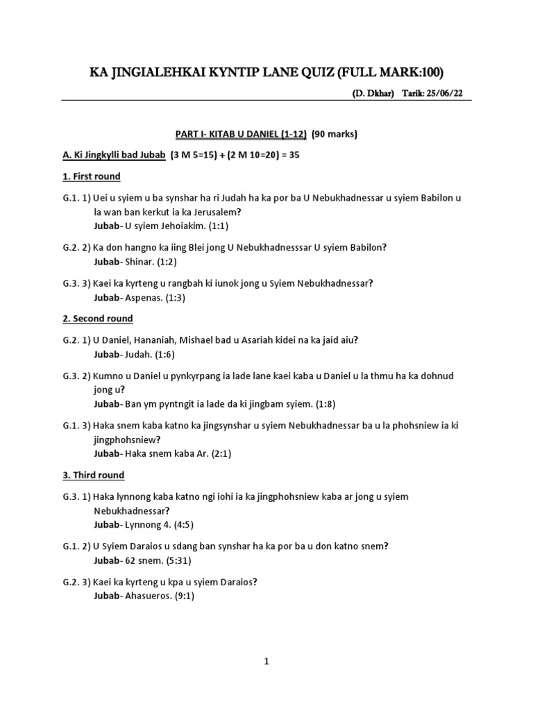 G.2. 1) U Daniel u la kyrpad ia u syiem ban ai por kumba shi taiew ban pyrkhat bha ia ka