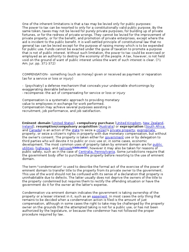 can be resorted to only for a constitutionally valid public purpose. By the same token, taxes may not be levied for purely private purposes, for building up of private fortunes, or for the redress of private wrongs. They cannot be levied for the improvement of private property, or for the benefit, and promotion of private enterprises, except where the aid is incident to the public benefit. It is well-settled principle of constitutional law that no general tax can be levied except for the purpose of raising money which is to be expended for public use. Funds cannot be exacted under the guise of taxation to promote a purpose that is not of public interest. Without such limitation, the power to tax could be exercised or employed as an authority to destroy the economy of the people. A tax, however, is not held void on the ground of want of public interest unless the want of such interest is clear. (71 Am. Jur. pp. 371-372) COMPENSATION- something (such as money) given or received as payment or reparation (as for a service or loss or injury) - (psychiatry) a defense mechanism that conceals your undesirable shortcomings by exaggerating desirable behaviors - recompense: the act of compensating for service or loss or injury Compensation is a systematic approach to providing monetary value to employees in exchange for work performed. Compensation may achieve several purposes assisting in recruitment, job performance, and job satisfaction.
