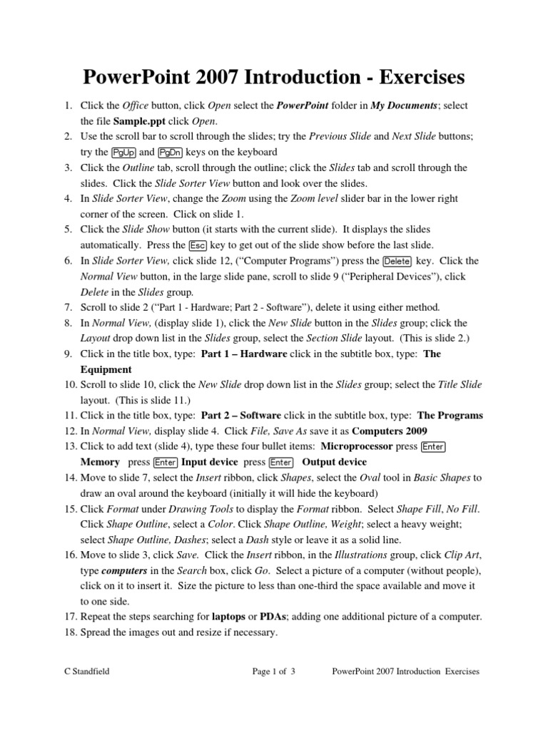 1. Click the Office button, click Open select the PowerPoint folder in My Documents; select the file [Link] click Open. 2. Use the scroll bar to scroll through the slides; try the Previous Slide and Next Slide buttons; try the p and q keys on the keyboard 3. Click the Outline tab, scroll through the outline; click the Slides tab and scroll through the slides. Click the Slide Sorter View button and look over the slides. 4. In Slide Sorter View, change the Zoom using the Zoom level slider bar in the lower right corner of the screen. Click on slide 1. 5. Click the Slide Show button (it starts with the current slide). It displays the slides automatically. Press the v key to get out of the slide show before the last slide. 6. In Slide Sorter View, click slide 12, (Computer Programs) press the d key. Click the Normal View button, in the large slide pane, scroll to slide 9 (Peripheral Devices), click Delete in the Slides group. 7. Scroll to slide 2 (Part 1 - Hardware; Part 2 - Software), delete it using either method. 8. In Normal View, (display slide 1), click the New Slide button in the Slides group; click the Layout drop down list in the Slides group, select the Section Slide layout. (This is slide 2.) 9. Click in the title box, type: Part 1 Hardware click in the subtitle box, type: The Equipment 10. Scroll to slide 10, click the New Slide drop down list in the Slides group; select the Title Slide layout. (This is slide 11.) 11. Click in the title box, type: Part 2 Software click in the subtitle box, type: The Programs 12. In Normal View, display slide 4. Click File, Save As save it as Computers 2009 13. Click to add text (slide 4), type these four bullet items: Microprocessor press e Memory press e Input device press e Output device 14. Move to slide 7, select the Insert ribbon, click Shapes, select the Oval tool in Basic Shapes to draw an oval around the keyboard (initially it will hide the keyboard) 15. Click Format under Drawing Tools to display the Format ribbon. Select Shape Fill, No Fill. Click Shape Outline, select a Color. Click Shape Outline, Weight; select a heavy weight; select Shape Outline, Dashes; select a Dash style or leave it as a solid line. 16. Move to slide 3, click Save. Click the Insert ribbon, in the Illustrations group, click Clip Art, type computers in the Search box, click Go. Select a picture of a computer (without people), click on it to insert it. Size the picture to less than one-third the space available and move it to one side. 17. Repeat the steps searching for laptops or PDAs; adding one additional picture of a computer. 18. Spread the images out and resize if necessary.