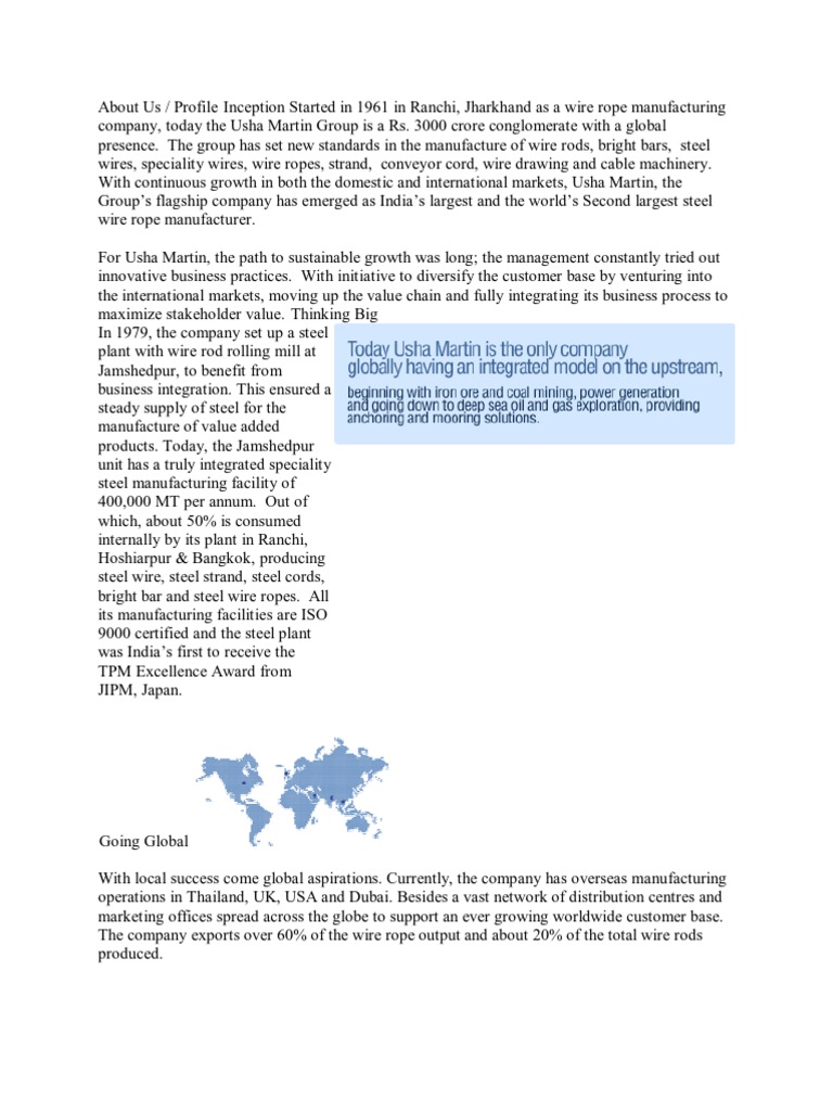 Group is a Rs. 3000 crore conglomerate with a global presence. The group has set new standards in the manufacture of wire rods, bright bars, steel wires, speciality wires, wire ropes, strand, conveyor cord, wire drawing and cable machinery. With continuous growth in both the domestic and international markets, Usha Martin, the Groups flagship company has emerged as Indias largest and the worlds Second largest steel wire rope manufacturer. For Usha Martin, the path to sustainable growth was long; the management constantly tried out innovative business practices. With initiative to diversify the customer base by venturing into the international markets, moving up the value chain and fully integrating its business process to maximize stakeholder value. Thinking Big In 1979, the company set up a steel plant with wire rod rolling mill at Jamshedpur, to benefit from business integration. This ensured a steady supply of steel for the manufacture of value added products. Today, the Jamshedpur unit has a truly integrated speciality steel manufacturing facility of 400,000 MT per annum. Out of which, about 50% is consumed internally by its plant in Ranchi, Hoshiarpur & Bangkok, producing steel wire, steel strand, steel cords, bright bar and steel wire ropes. All its manufacturing facilities are ISO 9000 certified and the steel plant was Indias first to receive the TPM Excellence Award from JIPM, Japan.