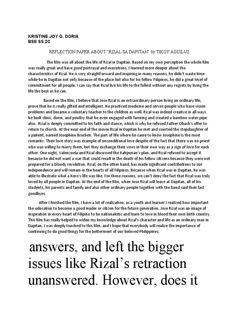 REFLECTION PAPER ABOUT “RIZAL SA DAPITAN” by TIKOY AGUILUZ