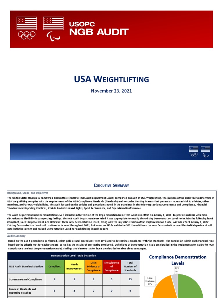 Overall, Audit concluded that USA Weightlifting has met most of the requirements outlined in the Standards. However, there is one area of increased concern.