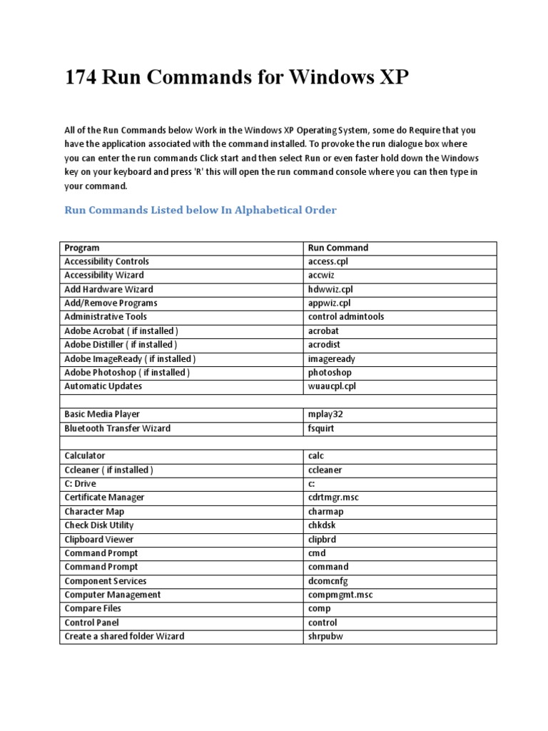 174 Run Commands for Windows XP
