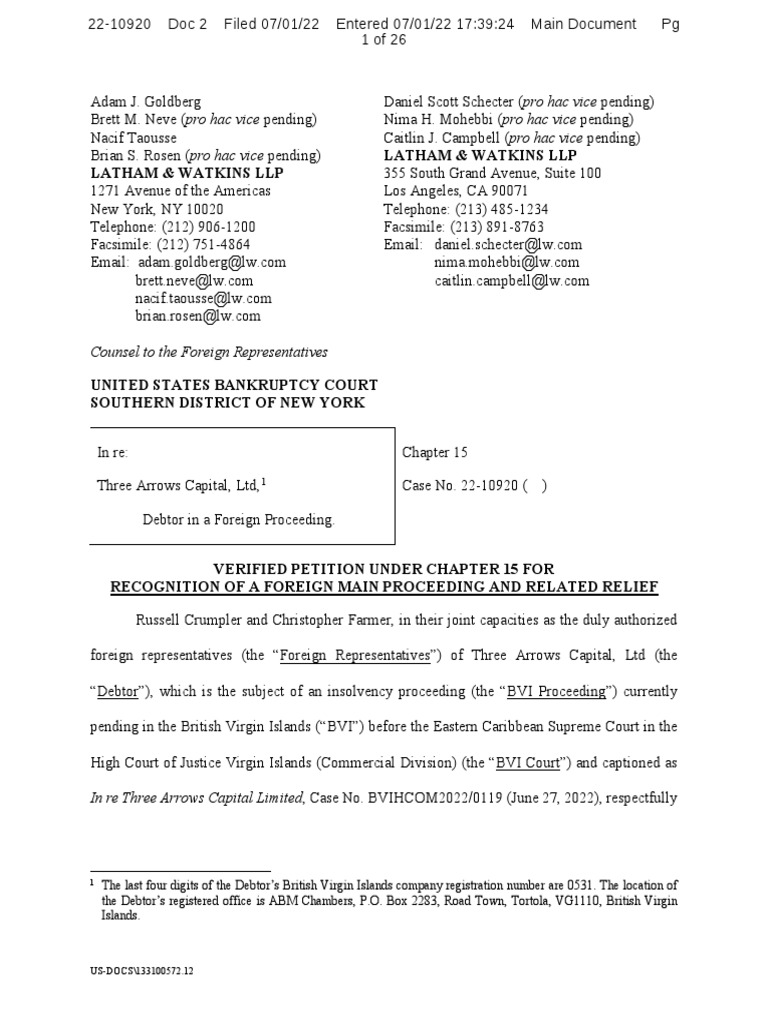 In re Three Arrows Capital Limited, Case No. BVIHCOM2022/0119 (June 27, 2022), respectfully