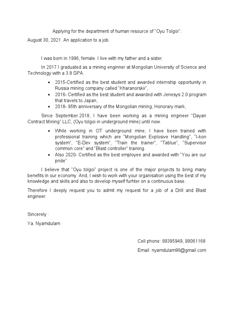 Applying for the department of human resource of “Oyu Tolgoi”: