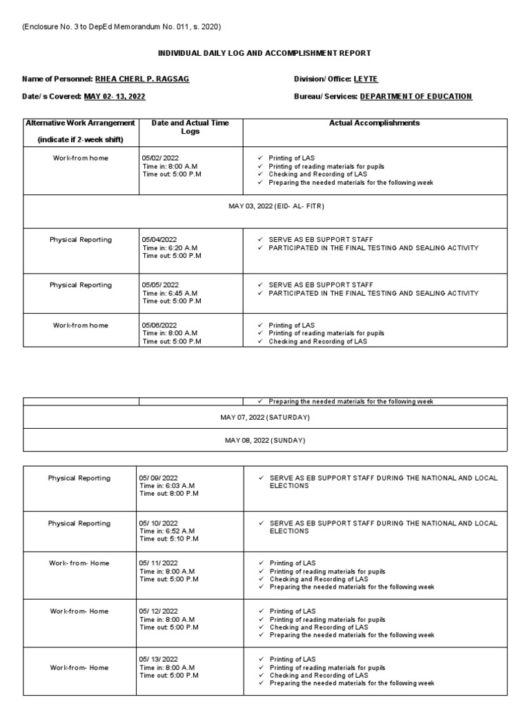 INDIVIDUAL DAILY LOG AND ACCOMPLISHMENT REPORT