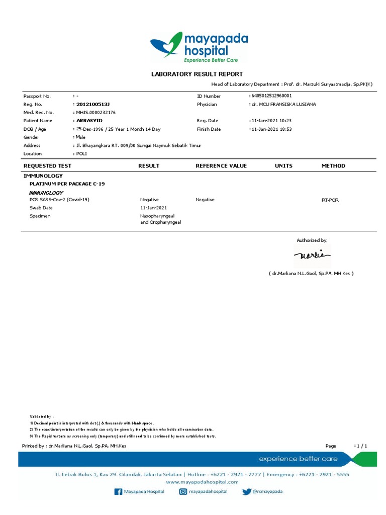 Patient Name : ARRASYID Reg. Date : 11-Jan-2021 10:23