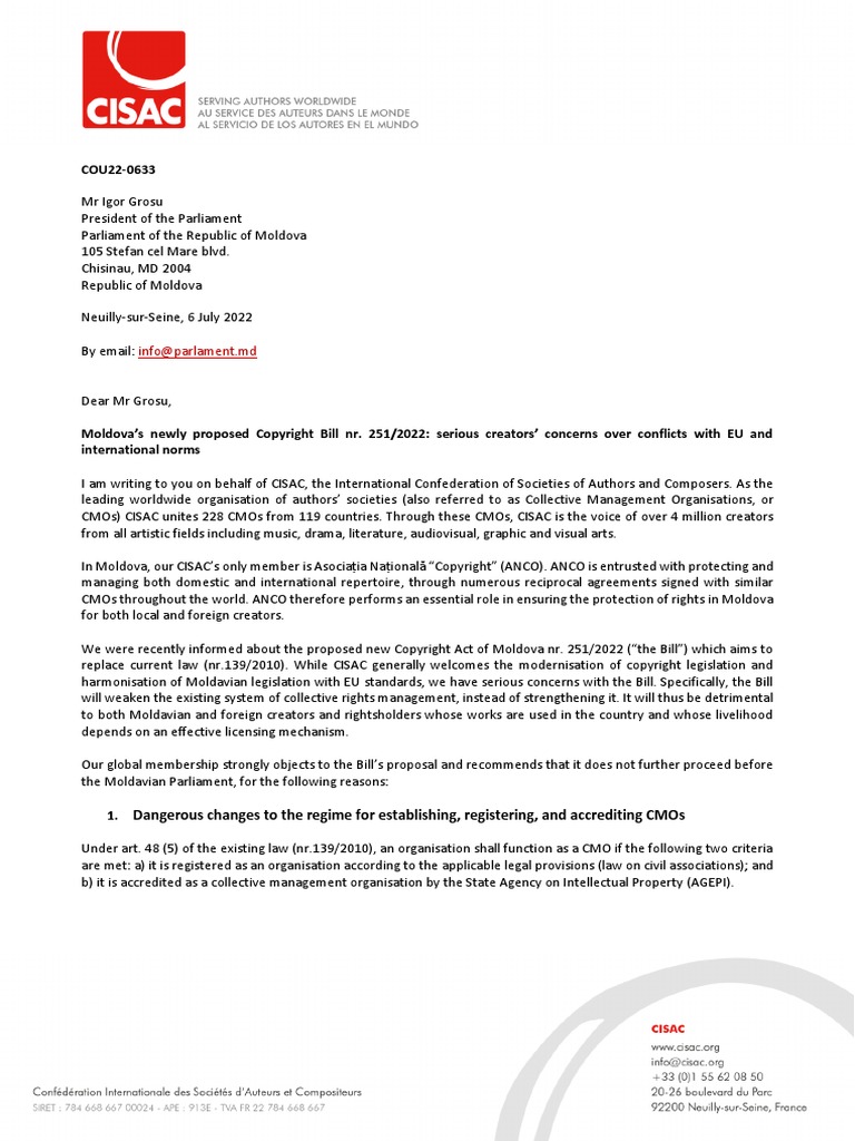 and jeopardise the positions of creators and their CMOs in Moldova, if adopted by the Parliament in its current form