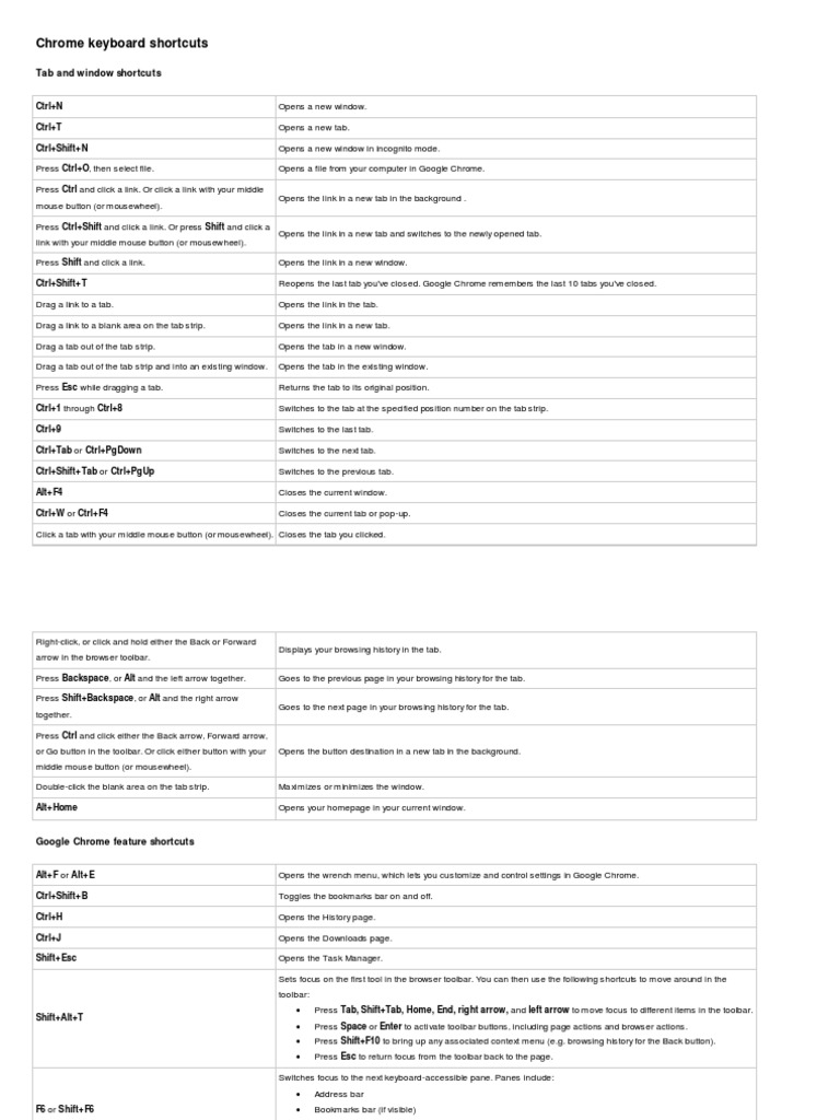 Opens the link in a new tab and switches to the newly opened tab. Opens the link in a new window. Reopens the last tab you've closed. Google Chrome remembers the last 10 tabs you've closed. Opens the link in the tab. Opens the link in a new tab. Opens the tab in a new window. Opens the tab in the existing window. Returns the tab to its original position. Switches to the tab at the specified position number on the tab strip. Switches to the last tab. Switches to the next tab. Switches to the previous tab. Closes the current window. Closes the current tab or pop-up.