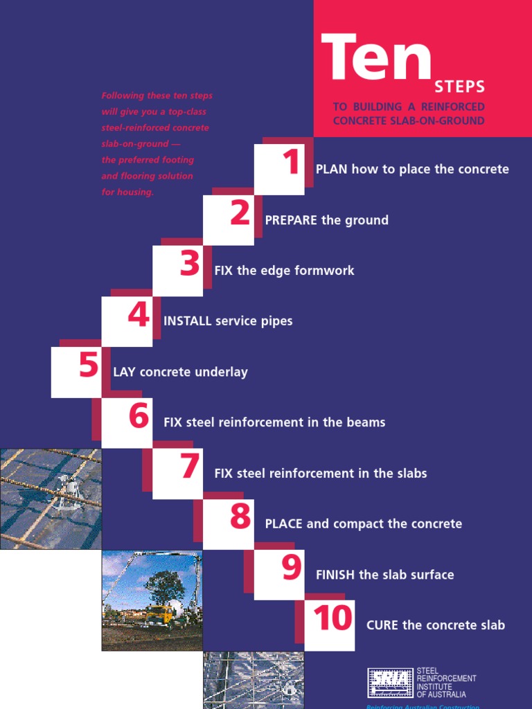 REINFORCED CONCRETE is a wonderful material, and is ideal for permanence and quality. The purpose of this brochure is to show the correct way to build a quality reinforced slab-on-ground, in an easy Ten Steps. We all know someone who could use a bit of advice to do things in a faster and better way. Maybe that someone is you; if so, the Ten Steps can save you real time and money. Reinforced concrete is like any other product or system, in that there is a right way and a wrong way to use it. This is the right way for slab-on-ground. So take the time to study these simple Ten Steps, it's in your interest.