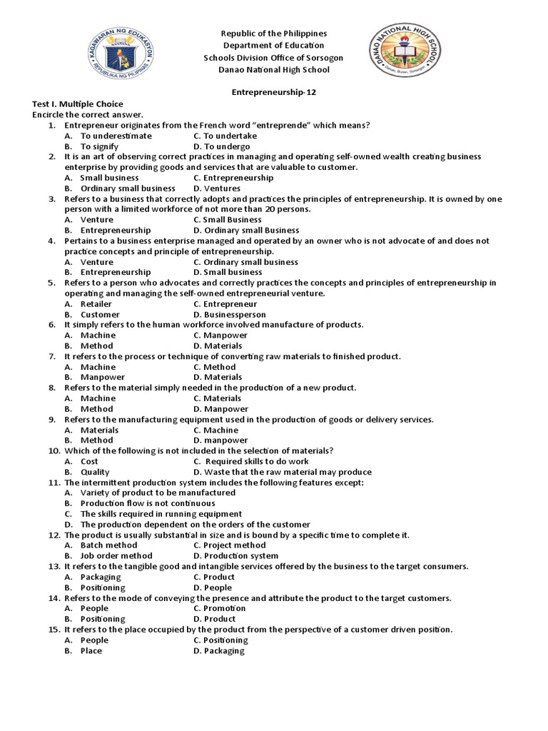 ___________3. Having a degree in entrepreneurship will assure a person that his/her business endeavor will succeed.