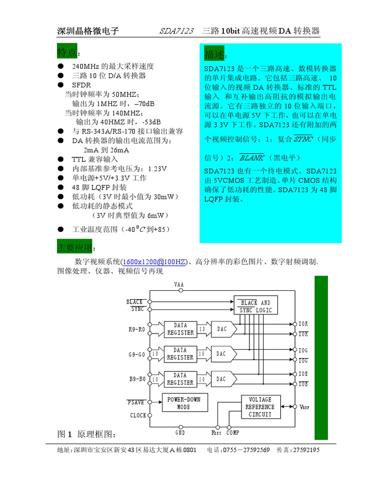 ● 240MHz 的最大采样速度 SDA7123 是一个三路高速、数模转换器