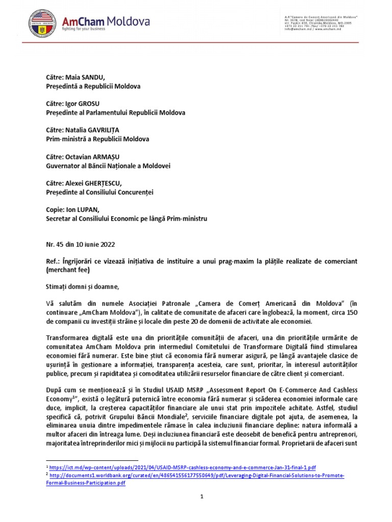 Ref.: Îngrijorări ce vizează inițiativa de instituire a unui prag-maxim la plățile realizate de comerciant