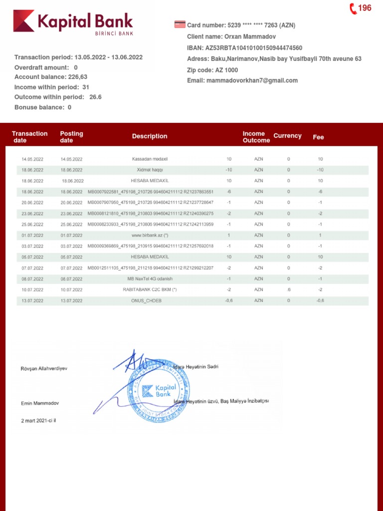 Transaction period: 13.05.2022 - 13.06.2022 Adress: Baku,Narimanov,Nasib bay Yusifbayli 70th aveune 63