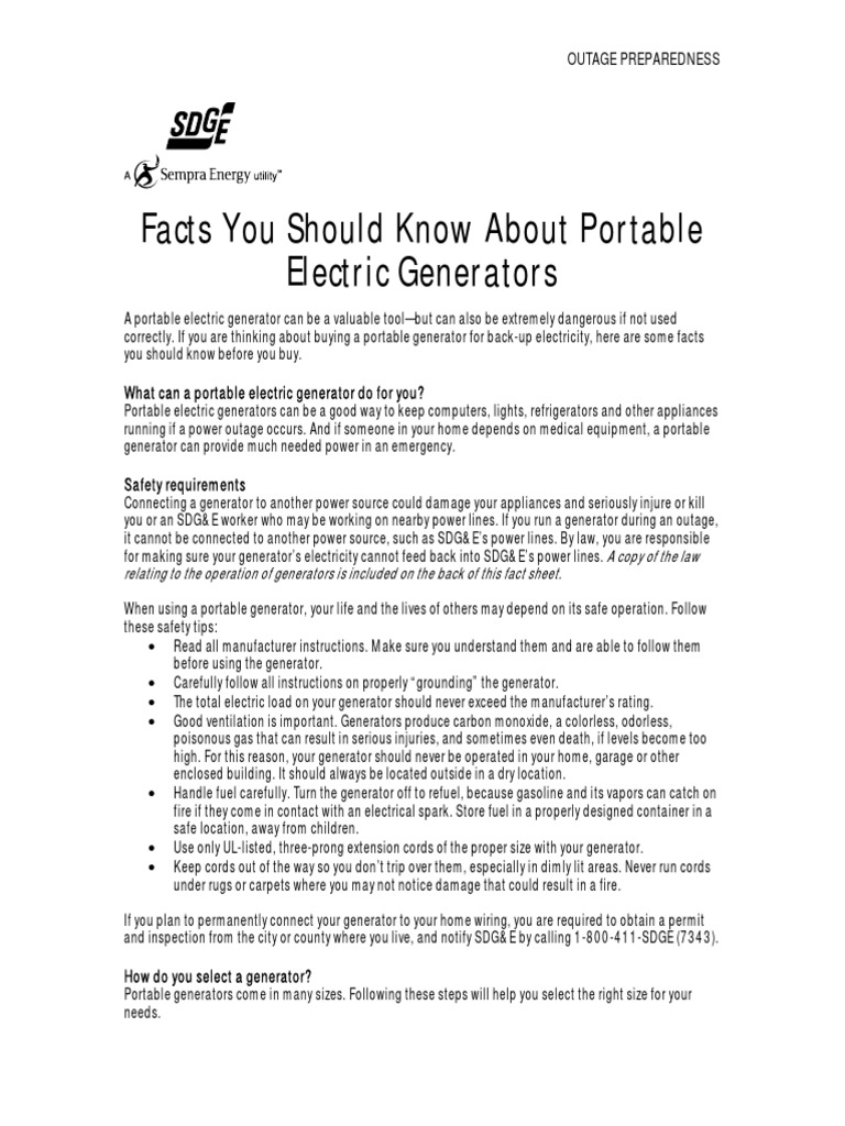 SDG&E at 1-800-411-SDGE (7343). For additional information on choosing a portable generator, talk to a